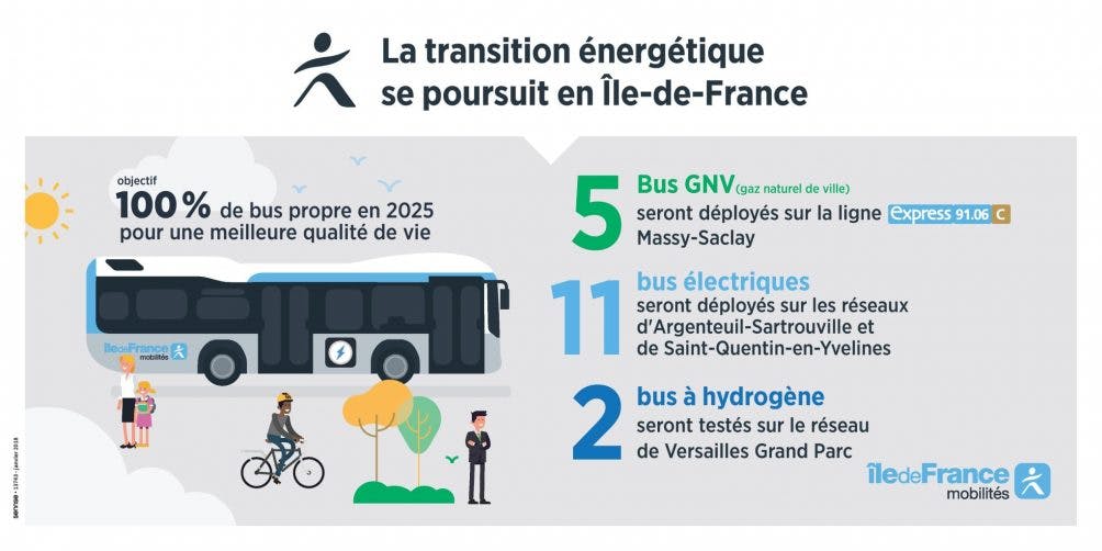 Infographie : La transition énergétique se poursuit en île-de-France. 100% de bus propres en 2005 pour une meilleure qualité de vie. 5 Bus GNV seront déployés sur la ligne Express 91.06C, Massy-Saclay. 11 bus électriques seront déployés sur les réseaux d'Argenteuil-Sartrouville et de Saint-Quentin-en-Yvelines. 2 bus à hydrogène seront testés sur le réseau de Versailles Grand Parc.