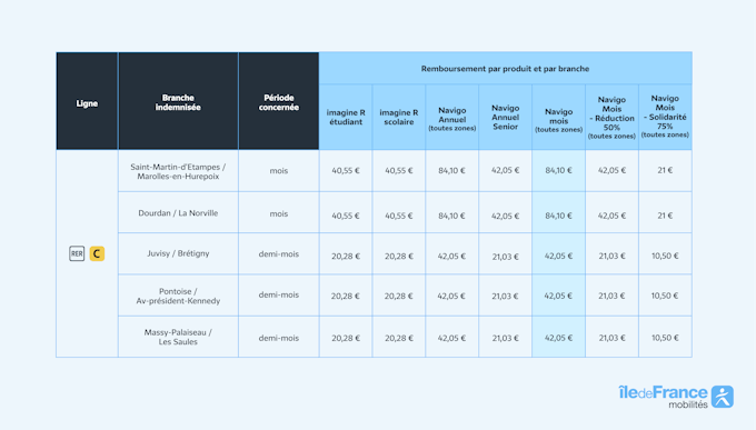 - Dourdan-la-Forêt <> La Norville - Saint-Germain-lès-Arpajon : 6 mois <80 % de ponctualité (avec la prise en compte des suppressions de trains la veille avant 17h), soit un remboursement allant jusqu'à 1 fois le montant du forfait mensuel,