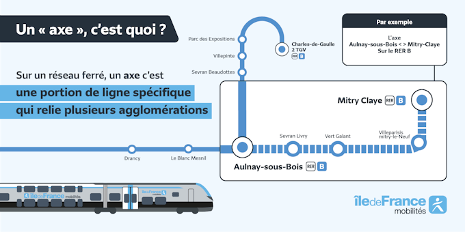 L'axe Aulnay-sous-Bois <> Mitry-Claye inclut les gares Mitry-Claye, Villeparisis Mitry-le-Neuf, Vert-Galant, Sevran-Livry, Aulnay-sous-Bois.