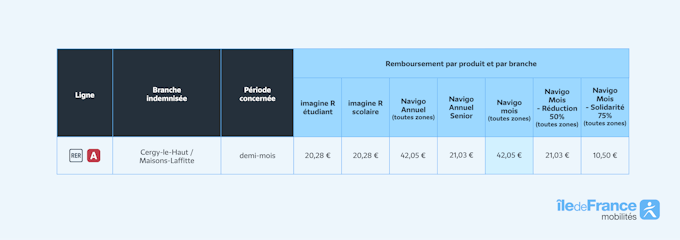- Axe Cergy-le-Haut <> Maisons-Laffitte : année 2023 <85 % de ponctualité, soit un remboursement allant jusqu'à 0,5 fois le montant du forfait mensuel,