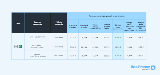 - Creil <> Goussainville : 3 mois <80 % de ponctualité, soit un remboursement allant jusqu'à 0,5 fois le montant du forfait mensuel,