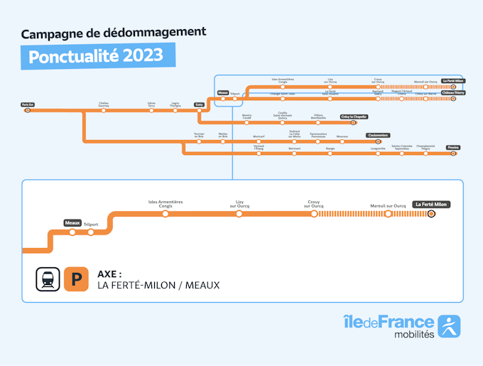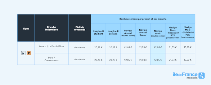 - Meaux <> La Ferté Milon : 3 mois <80 % de ponctualité, soit un remboursement allant jusqu'à 0,5 fois le montant du forfait mensuel,