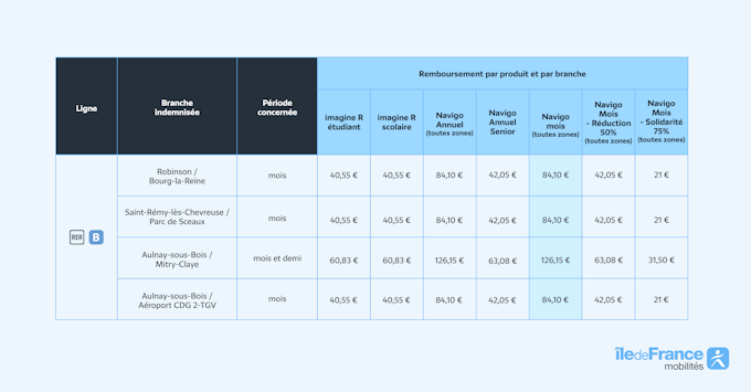 - Aulnay-sous-Bois <> Mitry-Claye : 10 mois <80 % de ponctualité, soit un remboursement allant jusqu'à 1,5 fois le montant du forfait mensuel,