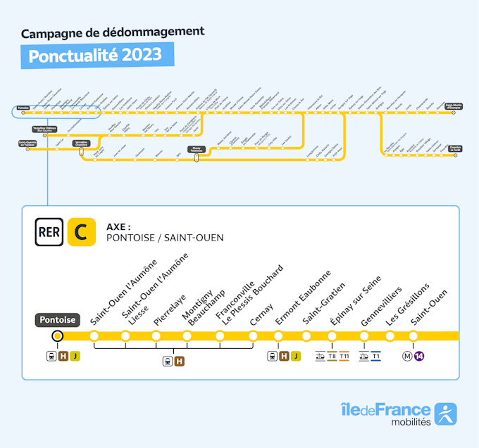 - Pontoise <> Saint-Ouen : 3 mois <80 % de ponctualité (avec la prise en compte des suppressions de trains la veille avant 17h), soit un remboursement allant jusqu'à 0,5 fois le montant du forfait mensuel,