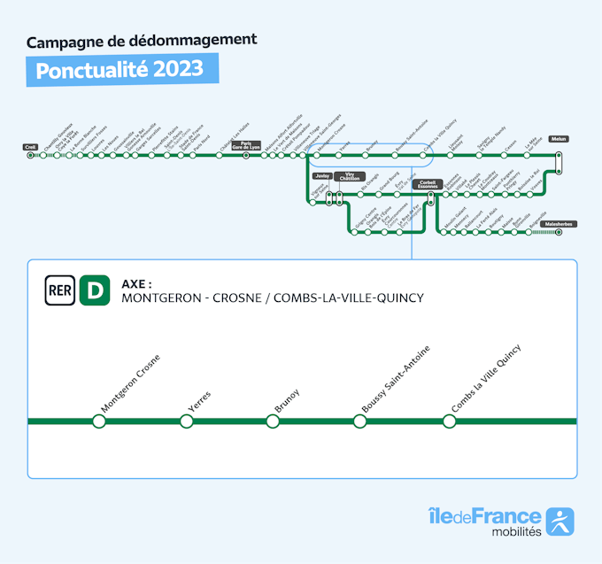- Montgeron - Crosne <> Combs-La-Ville-Quincy : année 2023 <85 % de ponctualité, soit un remboursement allant jusqu'à 0,5 fois le montant du forfait mensuel