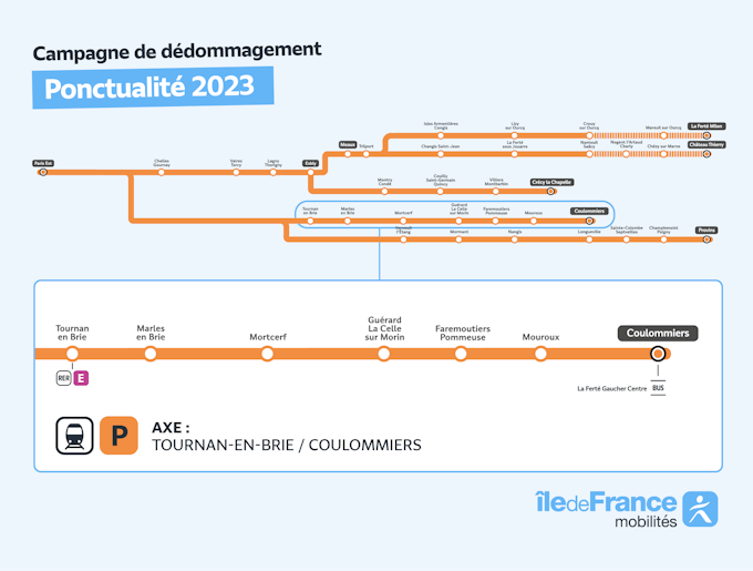 - Coulommiers <> Tournan-en-Brie : 4 mois <80 % de ponctualité (avec la prise en compte des suppressions de trains la veille avant 17h), soit un remboursement allant jusqu'à 0,5 fois le montant du forfait mensuel.
