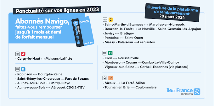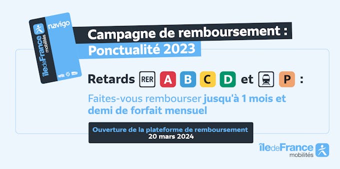 Pour cette raison et pour la troisième année consécutive, Île-de-France Mobilités lance, du 20 mars au 24 avril 2024, une campagne de remboursement pour dédommager les abonnés Navigo impactés par la baisse de ponctualité en 2023.