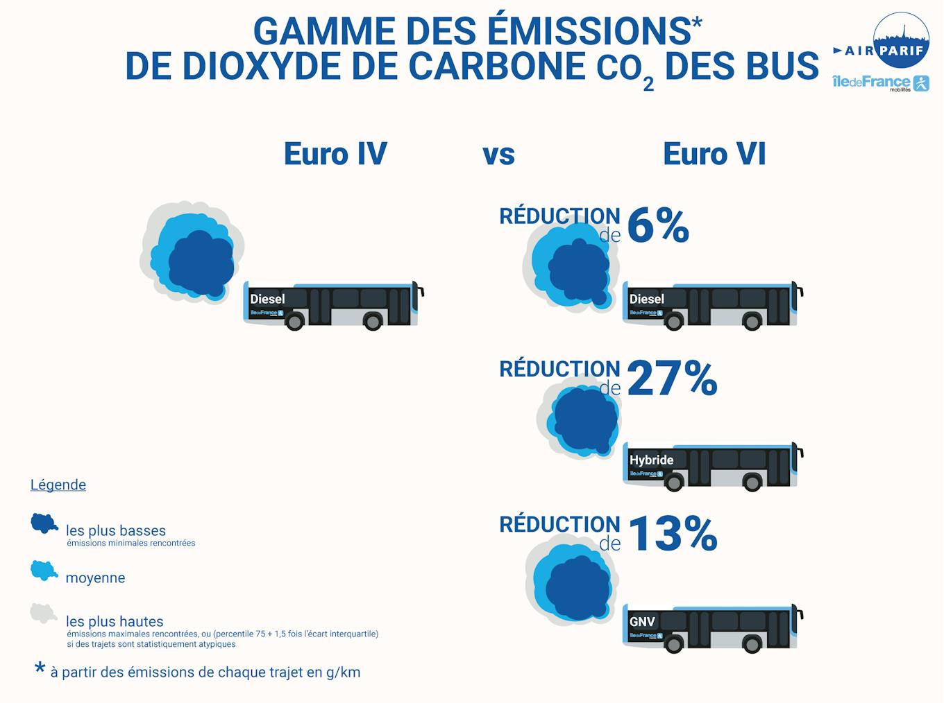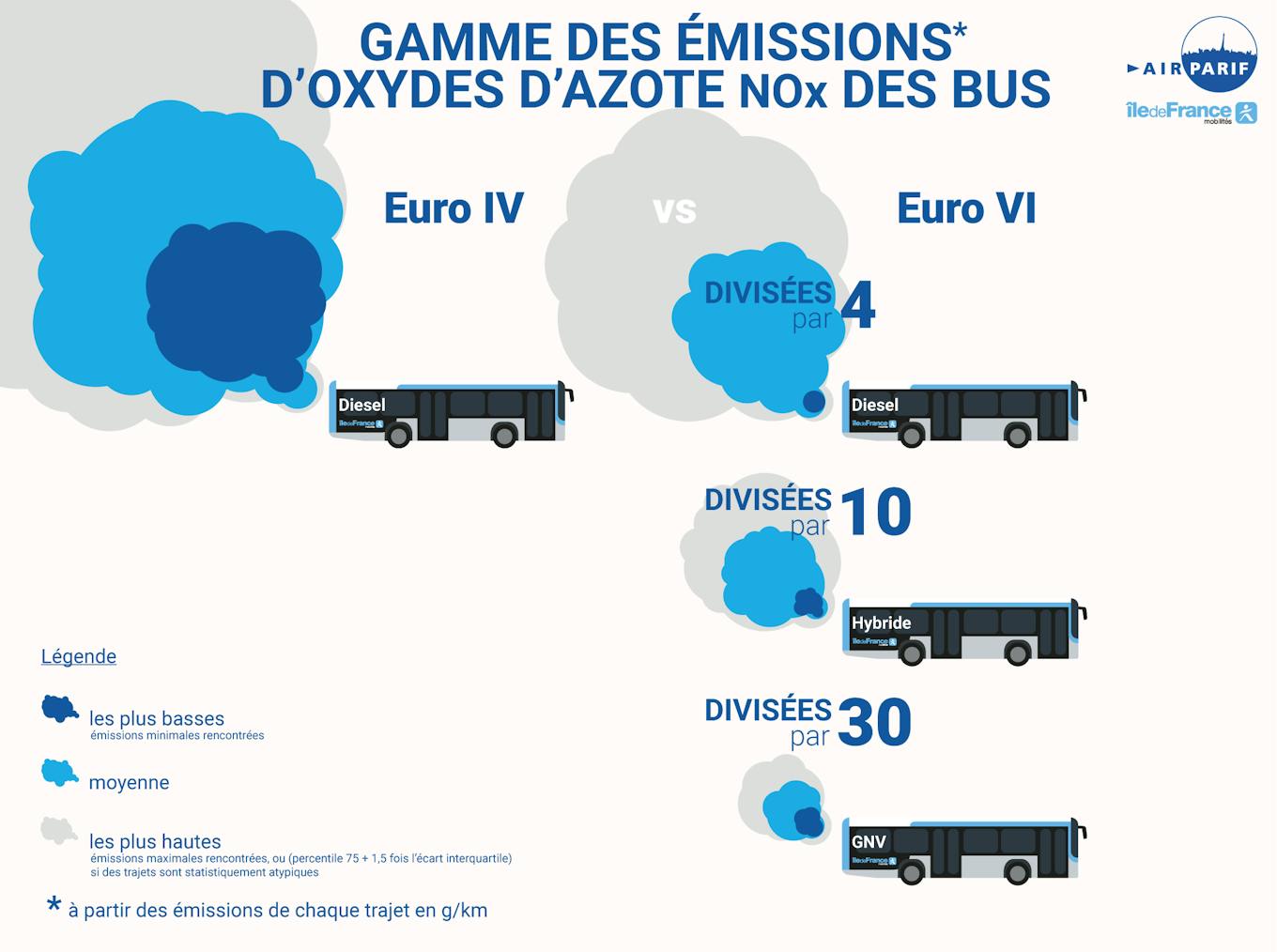 Le remplacement entre 2014 et 2020 par Île-de-France Mobilités de plus de 2 000 bus (Euro II, III et IV) sur un parc initial de plus de 9 000 véhicules par des bus plus récents (bus Euro VI, hybrides, GNC et électriques) a réduit d’environ un tiers les émissions annuelles d’oxydes d’azote (NOx), de particules à l’échappement (PN) et de moins de 5 % les émissions de CO2 des bus.