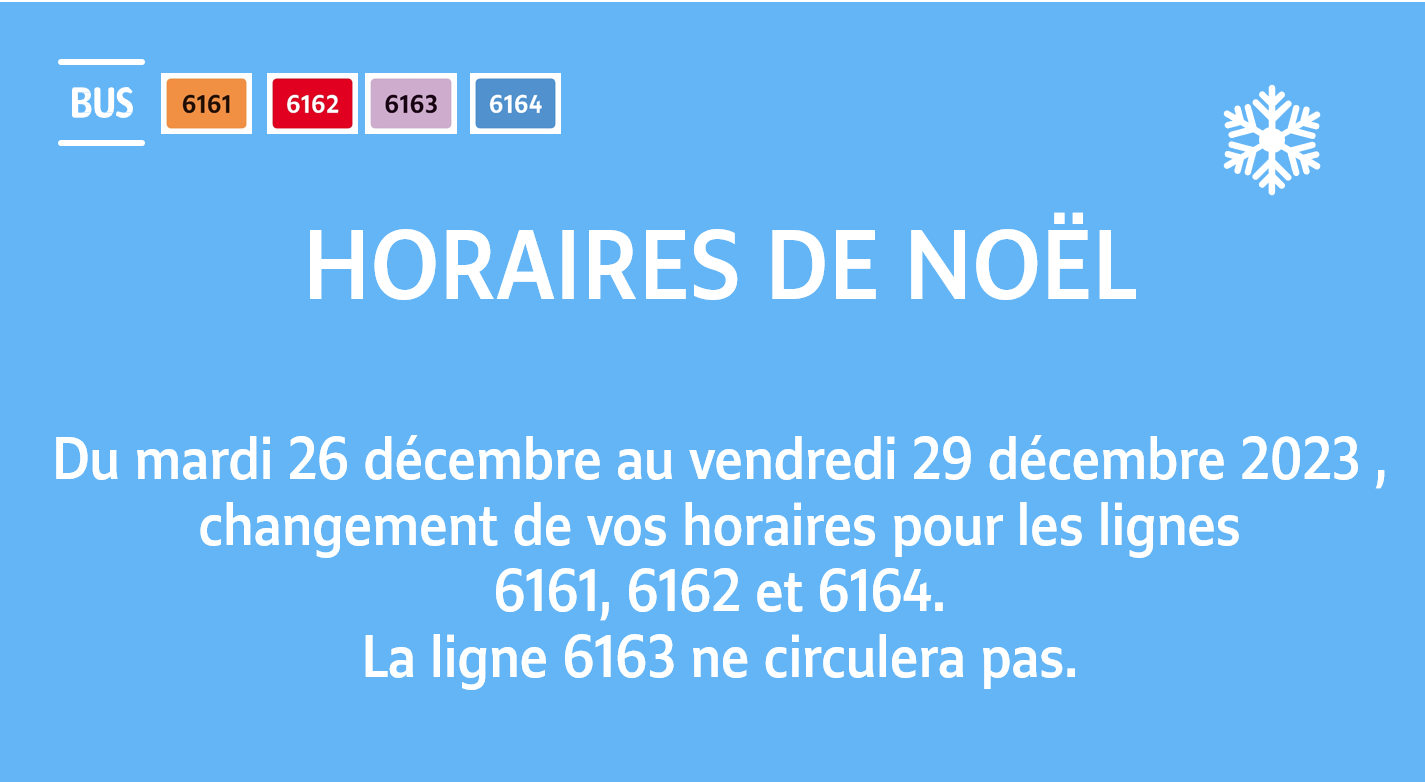 Les horaires du lundi 25 décembre 2023 (jour férié) et du week-end (samedi 30, dimanche 31 décembre et lundi 1er janvier 2024) restent inchangés et sont disponibles sur vos fiches horaires habituelles.
