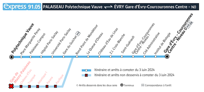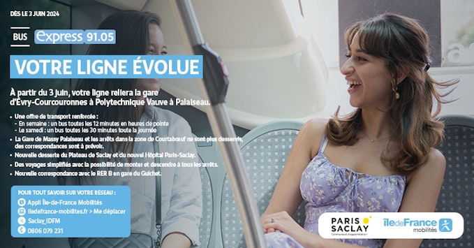 En raison de la mise en service du tramway T12 qui relie Evry Courcouronnes et Massy, votre ligne express 91.05 évolue pour permettre une meilleure desserte du territoire. A partir du 3 juin 2024, voici ce qui changera :