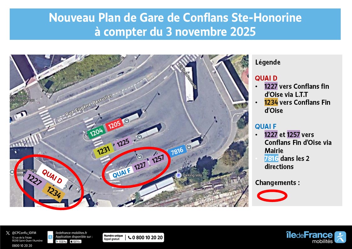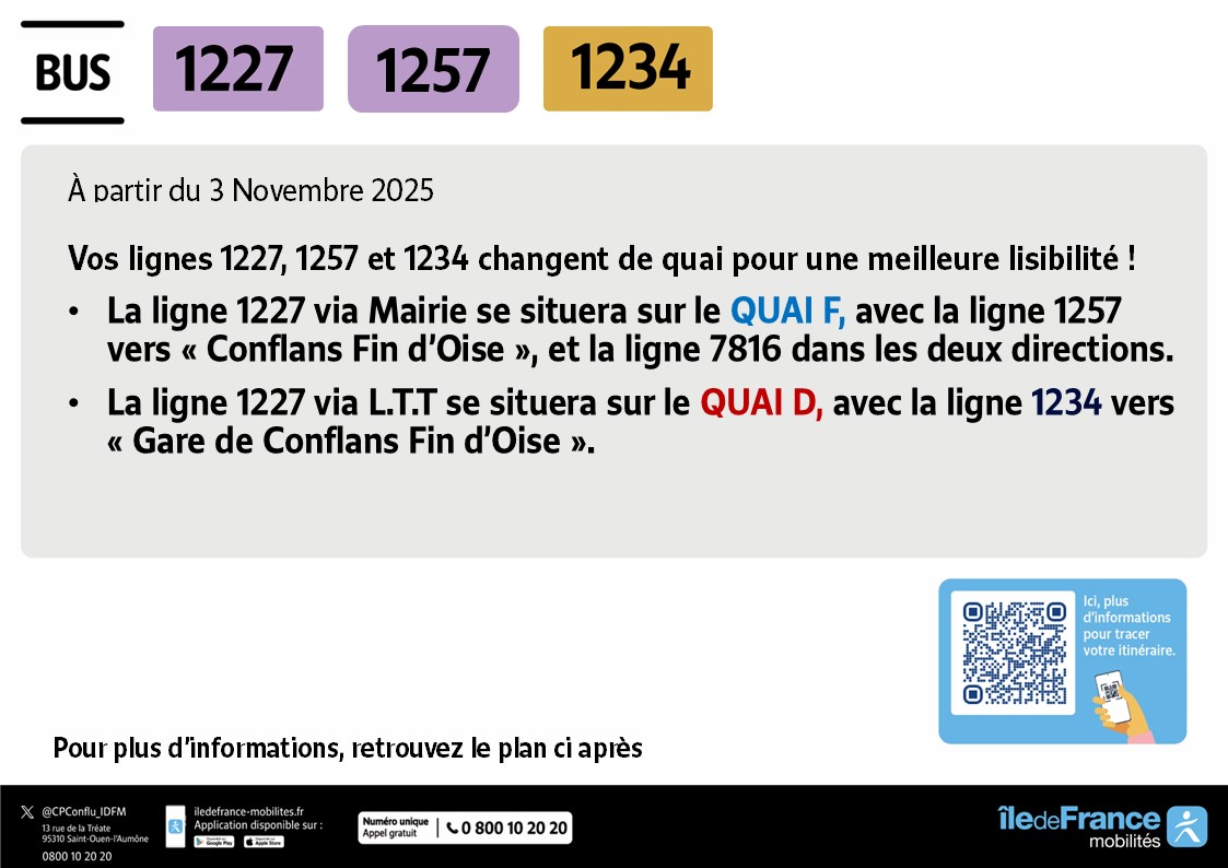 - La ligne 1227 via Mairie se situera sur le QUAI F, avec la ligne 1257 vers « Conflans Fin d’Oise » et la ligne 7816.