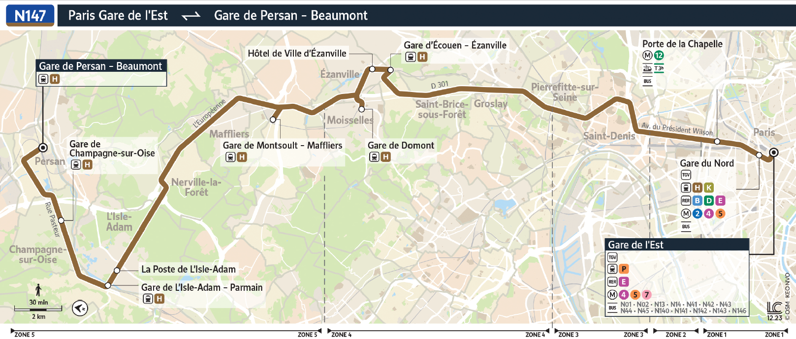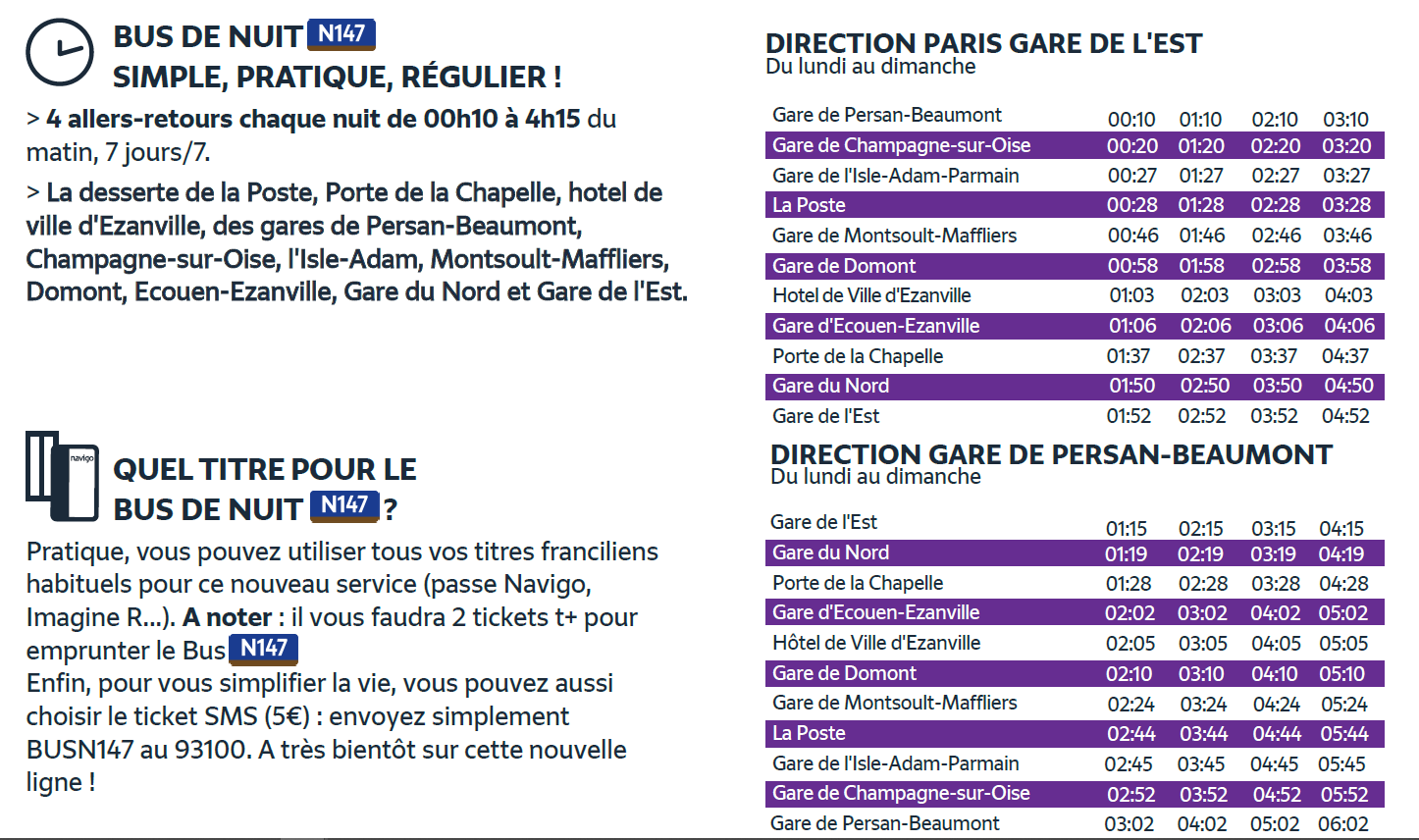 Mise en service de la ligne N147 entre la gare de l'Est et la gare de Persan-Beaumont avec 4 allers-retours de 00h10 4h15, 7 jours / 7.