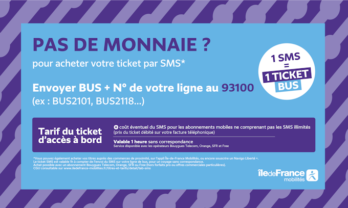 Le Ticket d’Accès à Bord SMS est vendu exclusivement à l’unité sur la ligne de bus empruntée. Vous serez débité sur votre facture mobile.