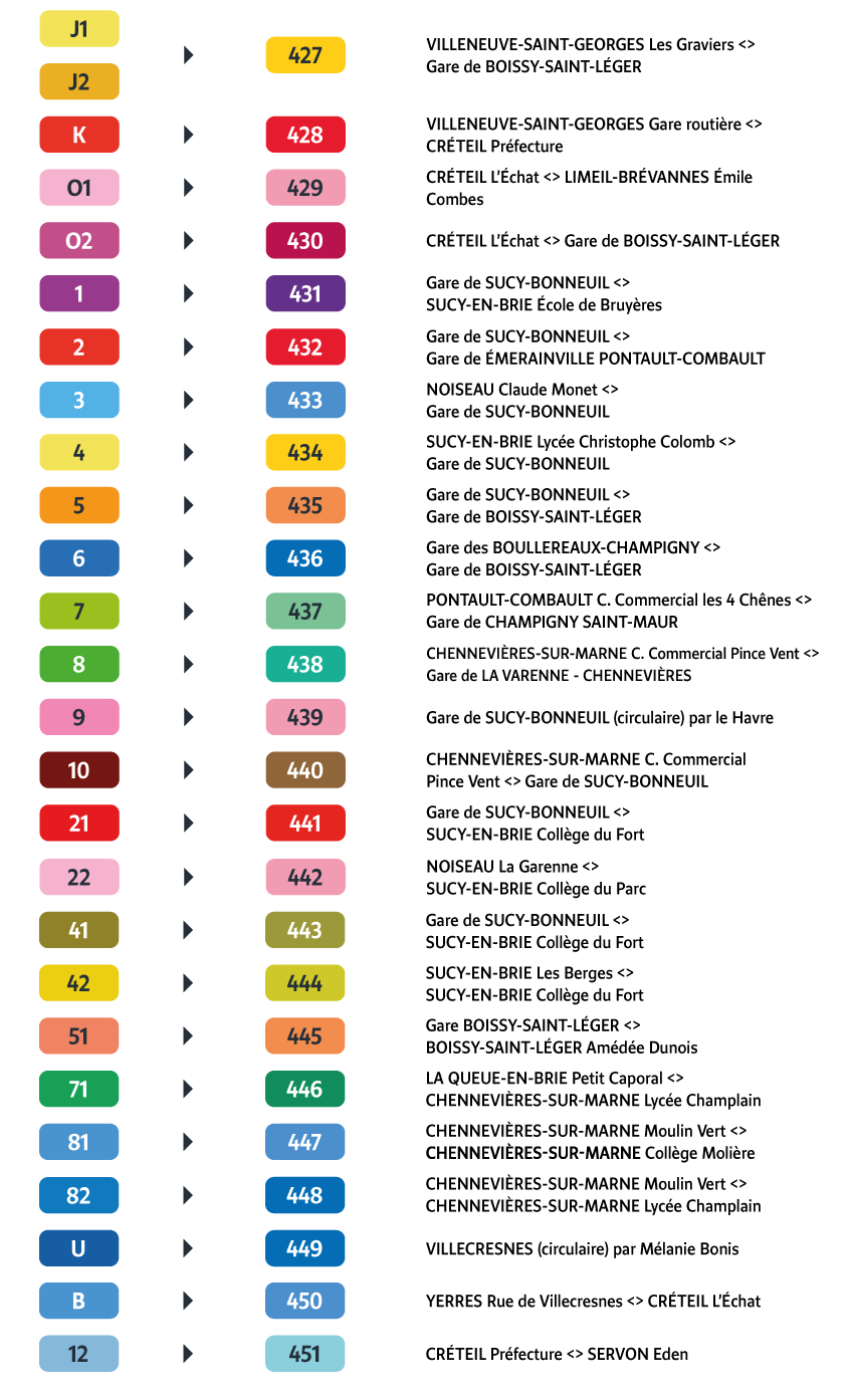 L’Île-de-France a été découpée par départements et secteurs, qui ont chacun un code spécifique. Sur le territoire Marne et Seine, toutes les lignes commencent désormais par 4 et à chaque fois que cela était possible, l’ancien numéro a été repris afin de faciliter le changement (exemple : la 1 devient 431, la ligne 2 devient 432, etc.).