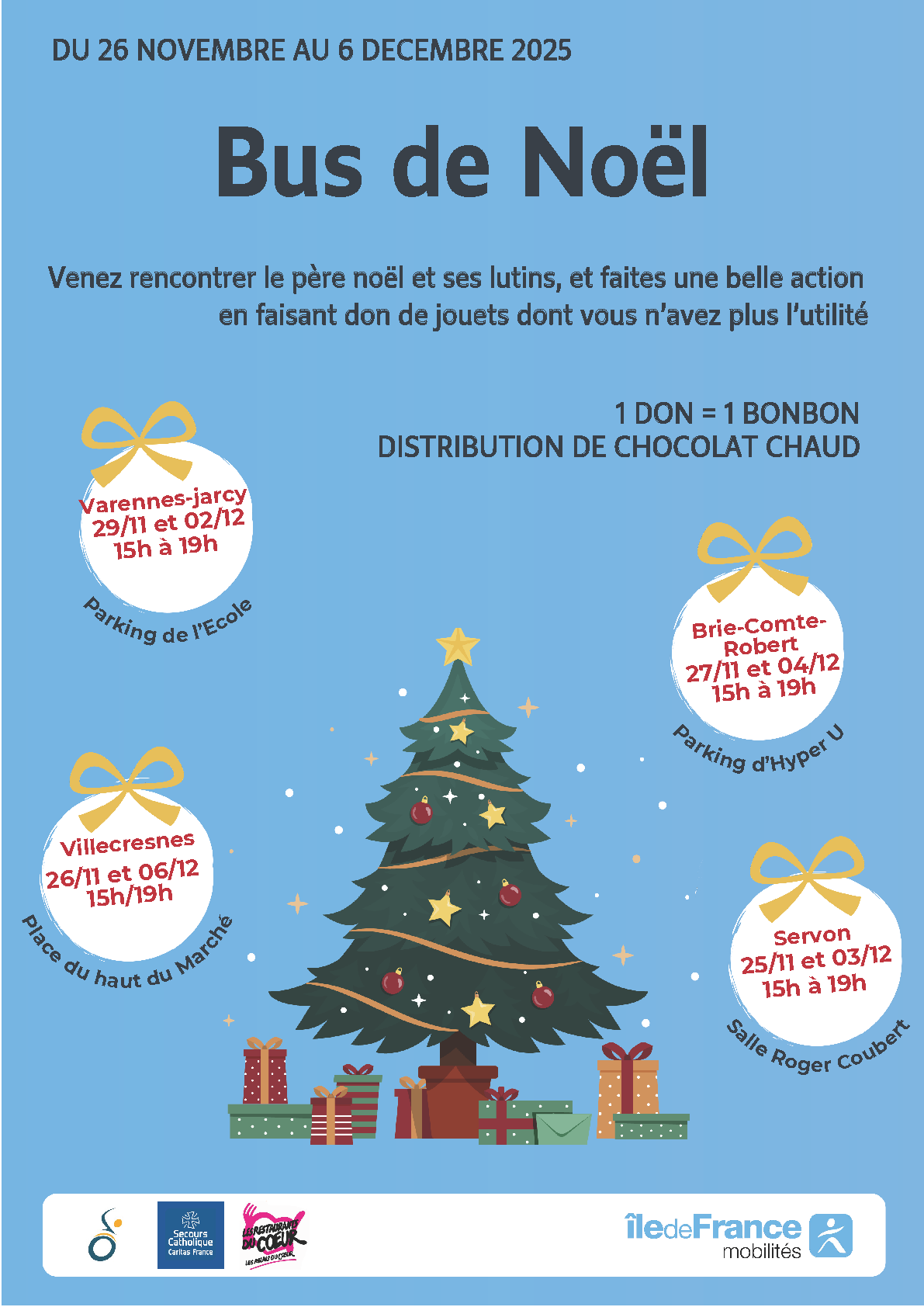 Retrouvez ci-dessous les dates de passage du bus de Noël 2025 dans chaque commune ainsi que les lieux et horaires de présence :