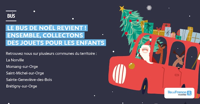 A l'approche des fêtes de fin d'année , le réseau de bus Île-de-France Mobilités du territoire de Cœur d'Essonne revient pour sa 7ème édition de collecte de jouets à bord du Bus de Noël.