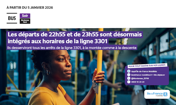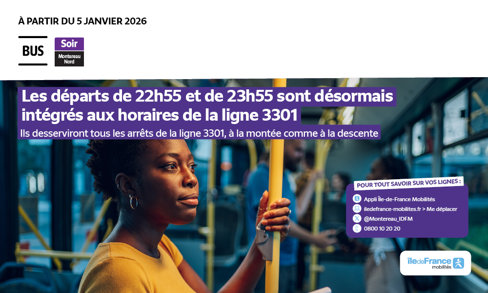 Les courses de 22h55 et 23h55 au départ de la Gare seront désormais assurées par la ligne 3301. Finies les montées à la Gare de Montereau exclusivement, vous pourrez monter à n'importe quels arrêts desservis par la ligne 3301 (Place Lepesme, Mairie...)