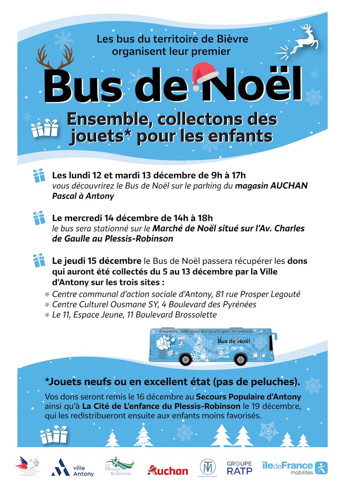 Cette année, votre réseau de transport local opéré par RATP Cap Bièvre pour le compte d’Île-de-France Mobilités met en œuvre sa première opération « Bus de Noël » 12 au 19 décembre, sur les villes d’Antony et Le Plessis-Robinson. Il s’agira de collecter des jouets neufs ou en très bon état qui seront ensuite remis au Secours Populaire d’Antony le 16 décembre ainsi qu’à La Cité de l’Enfance du Plessis-Robinson le 19 décembre. Ces organismes caritatifs et sociaux les redistribueront ensuite aux enfants moins favorisés.