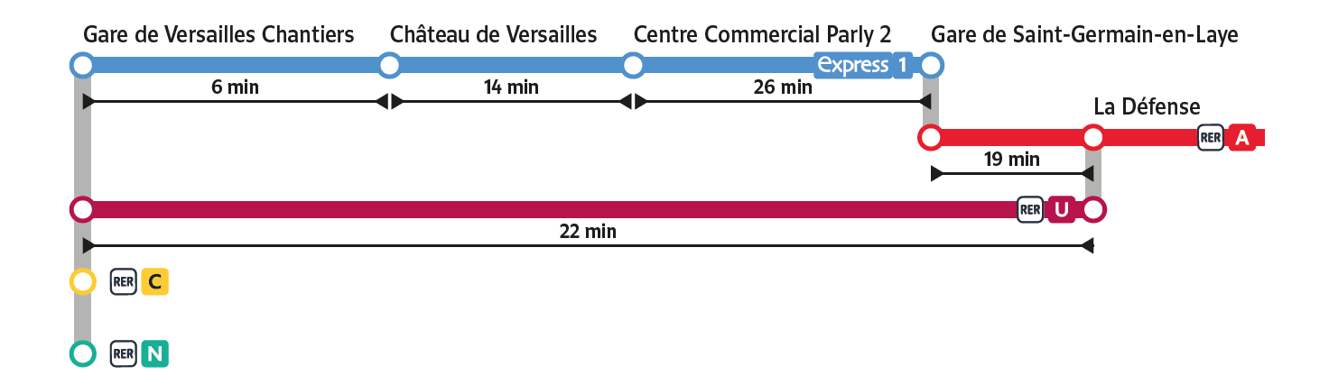 Pensée pour vous simplifier le quotidien, la ligne Express 1 assure des liaisons rapides et régulières entre les gares de Saint-Germain-en-Laye et Versailles Chantiers avec :