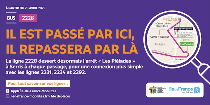 À partir du 28 avril 2025, les usagers de la ligne de bus 2228 pourront bénéficier d’un nouvel arrêt stratégique à « Les Pléiades », situé à Serris. Ce changement vise à faciliter les correspondances et améliorer la mobilité dans le secteur.