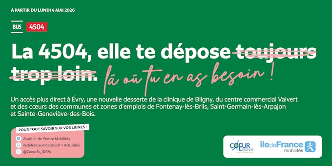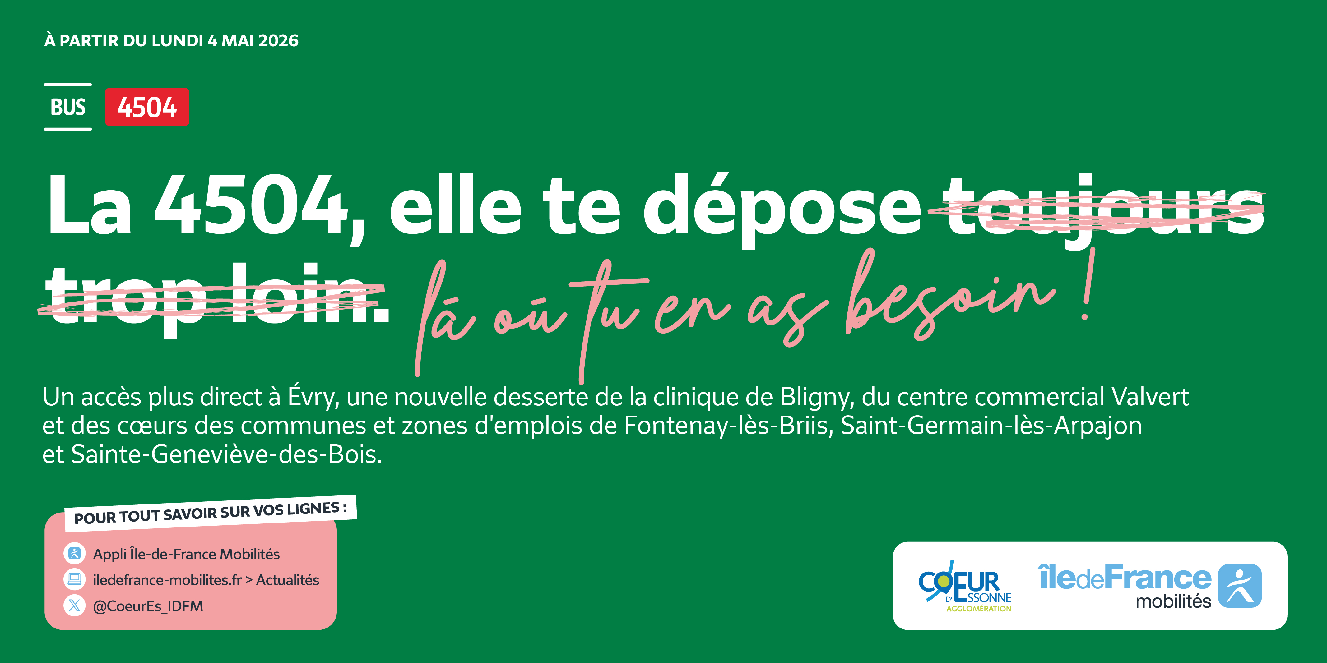 Afin d’améliorer les déplacements sur le territoire de Cœur d’Essonne, la ligne 4504 évolue à compter du 4 mai 2026 avec un itinéraire ajusté dans Evry et le rajout de 4 arrêts.