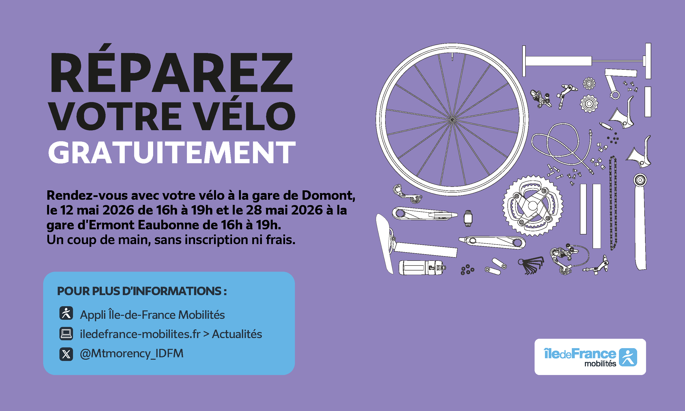 À l’occasion de Mai à Vélo, Île-de-France Mobilités vous accompagne dans ce mois dédié à l’utilisation de ce mode de transport doux afin de promouvoir le service de parkings vélos. Ainsi, sur votre territoire de Vallée de Montmorency, Île-de-France Mobilités organise des stands de réparations de vélos en gare.