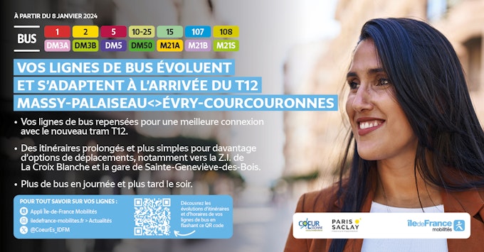 - Nouvelle connexion avec le tram T12 aux arrêts « Gare d’Épinay-sur-Orge », «Gare de Longjumeau» et «Gare de Massy-Palaiseau» avec la ligne 107.