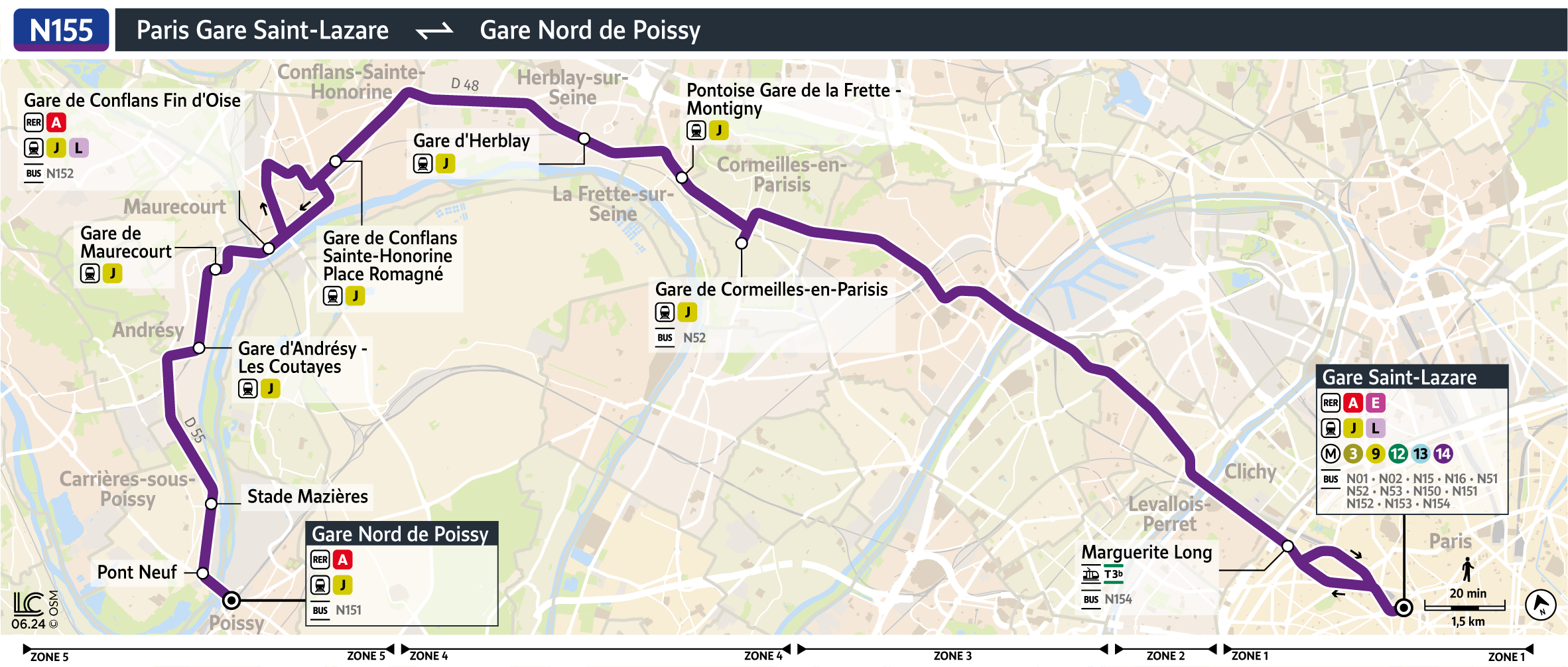 La ligne N155 relie la gare de Paris Saint-Lazare à Poissy en passant par la Porte d'Asnières, les gares de Cormeilles-en-Parisis, la Frette-Montigny, Herblay, Conflans-Sainte-Honorine, Conflans Fin-d'Oise, Maurecourt et Andrésy.