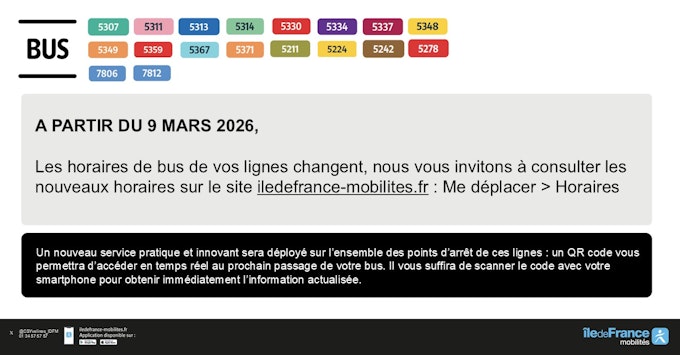 Plusieurs lignes du territoire de Centre et Sud Yvelines changent d'horaires à partir du lundi 9 mars 2026 :