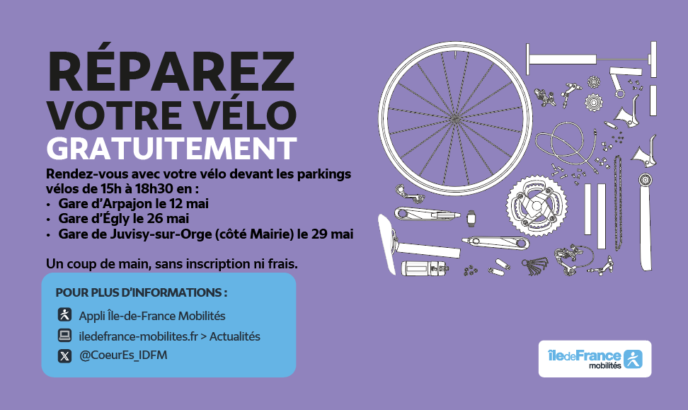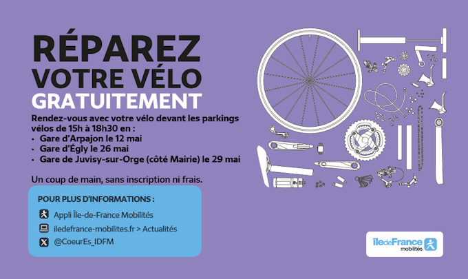 A l’occasion de Mai à Vélo, Île-de-France Mobilités vous accompagne dans ce mois dédié à l’utilisation de ce mode de transport doux afin de promouvoir le service de parkings vélos. Ainsi, sur votre territoire de Cœur d'Essonne, Île-de-France Mobilités organise des stands de réparations de vélos en gare.
