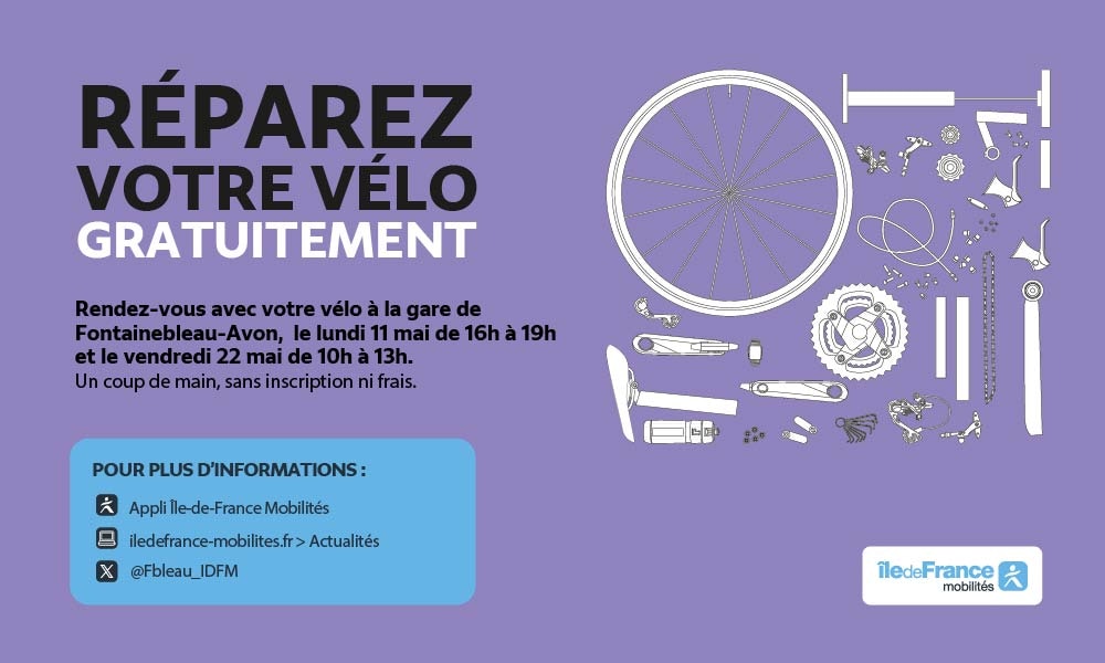 Retrouvez nos équipes au Parking Vélos de la gare de Fontainebleau-Avon le lundi 11 mai de 16h à 19h et le vendredi 22 mai de 10h à 13h.