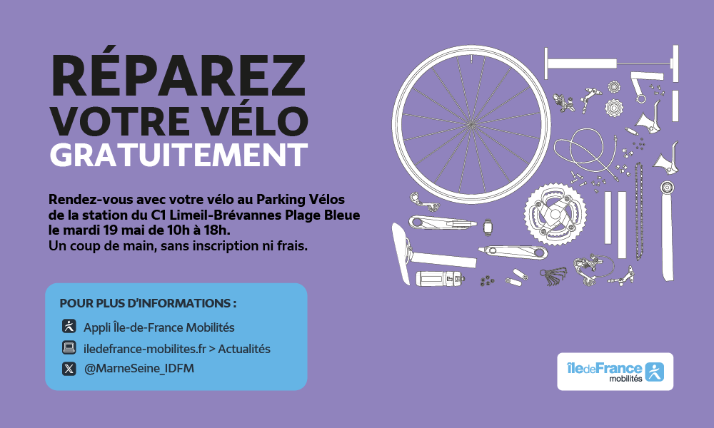 À l’occasion de Mai à Vélo, Île-de-France Mobilités vous accompagne dans ce mois dédié à l’utilisation de ce mode de transport doux afin de promouvoir le service de parkings vélos. Ainsi, sur votre territoire de Marne et Seine, Île-de-France Mobilités organise un stand de réparations de vélos en station.