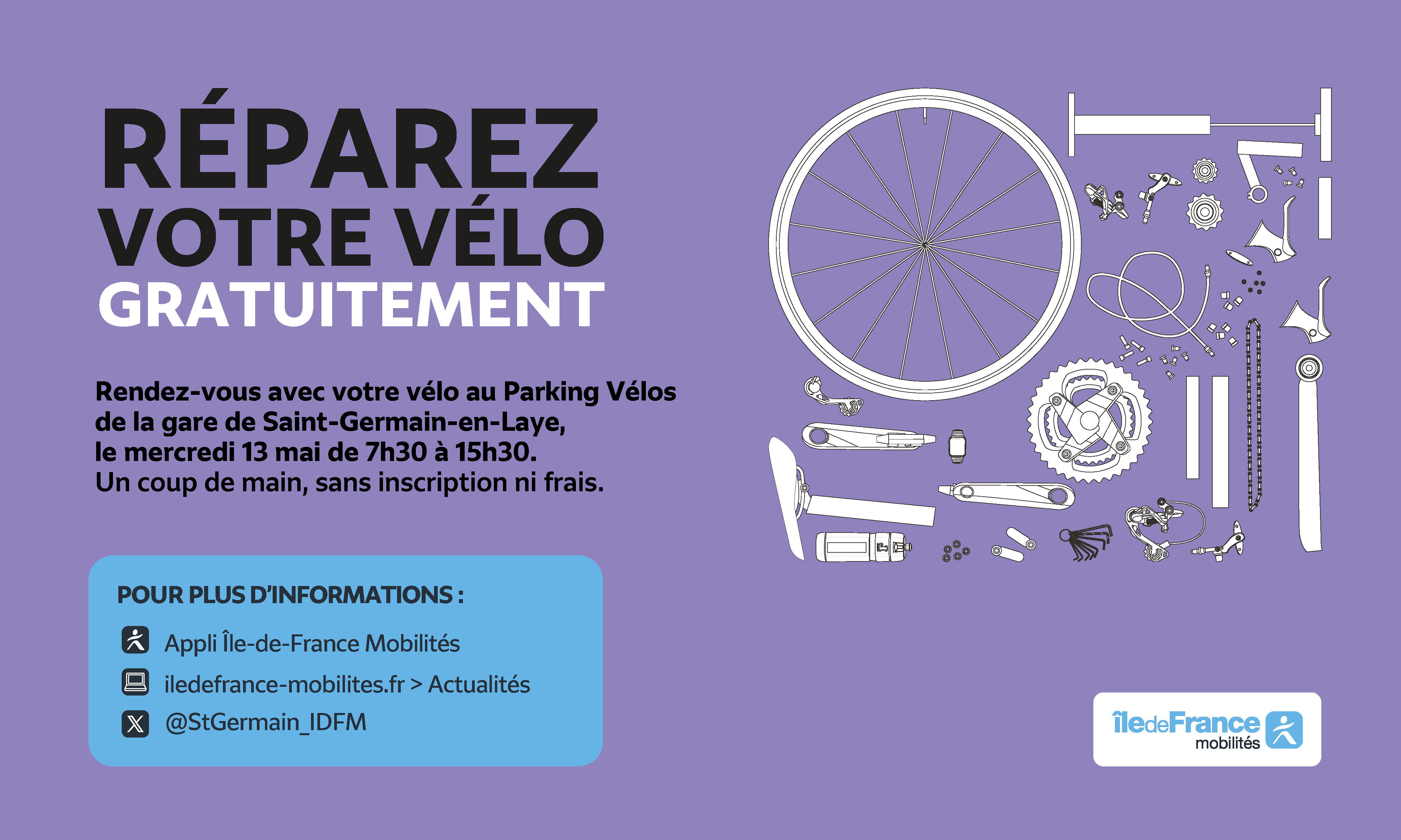 À l’occasion de Mai à Vélo, Île-de-France Mobilités vous accompagne dans ce mois dédié à l’utilisation de ce mode de transport doux afin de promouvoir le service de parkings vélos. Ainsi, sur votre territoire de Saint Germain Boucles de Seine, Île-de-France Mobilités organise un stand de réparations de vélos en gare.