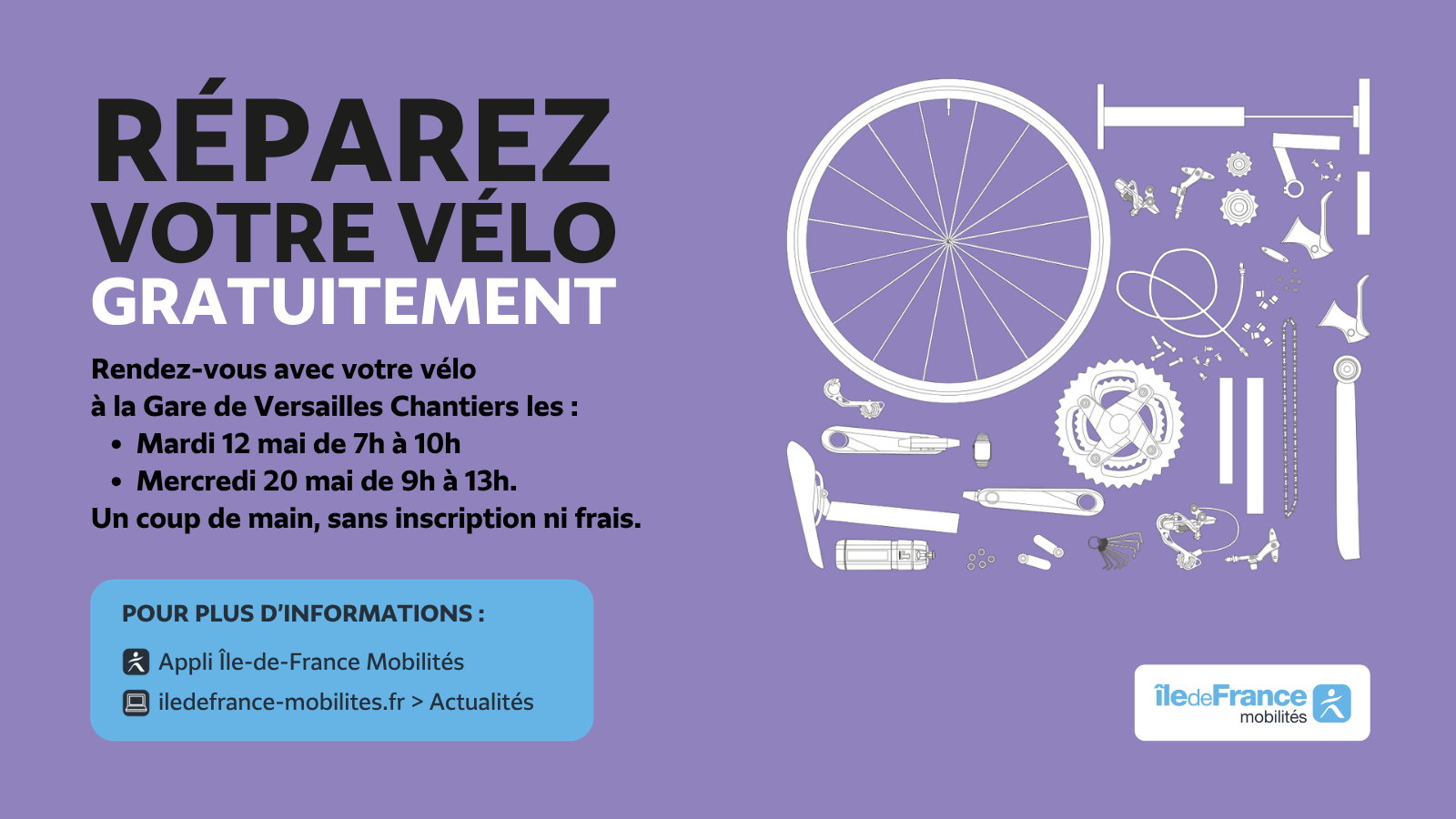 A l'occasion de Mai à Vélo, Île-de-France Mobilités vous accompagne dans l'utilisation de ce mode de transport doux. Ainsi, sur le territoire de Grand Versailles, Île-de-France Mobilités organise des stands de réparations de vélos en gare.