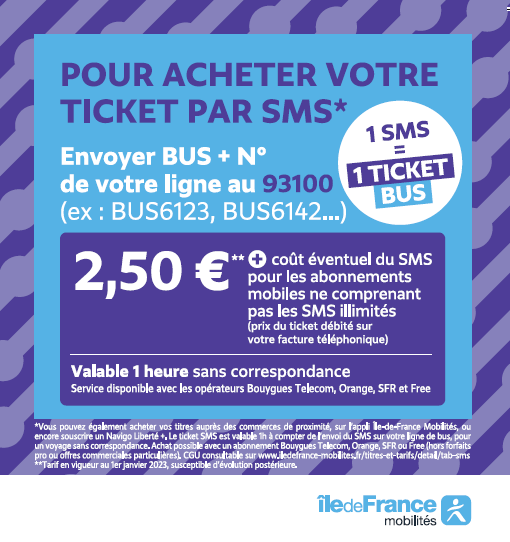 Le Ticket d’Accès à Bord SMS est vendu exclusivement à l’unité sur la ligne de bus empruntée. Vous serez débité sur votre facture mobile.