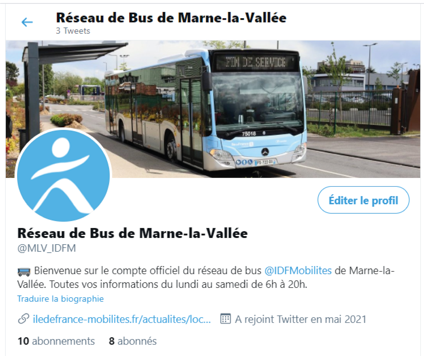Page twitter du compte du réseau de bus de Marne-la-Vallée @MLV_IDFM. Description du compte, adresse du site internet