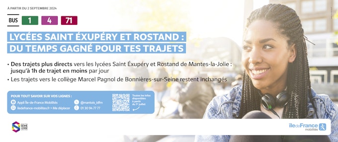 À partir du 2 septembre 2024, vos lignes 1, 4 et 71 évoluent, vous permettant de gagner jusqu’à 1h de trajet pour vos déplacements quotidiens vers les lycées Saint Exupéry et Rostand de Mantes-la-Jolie.