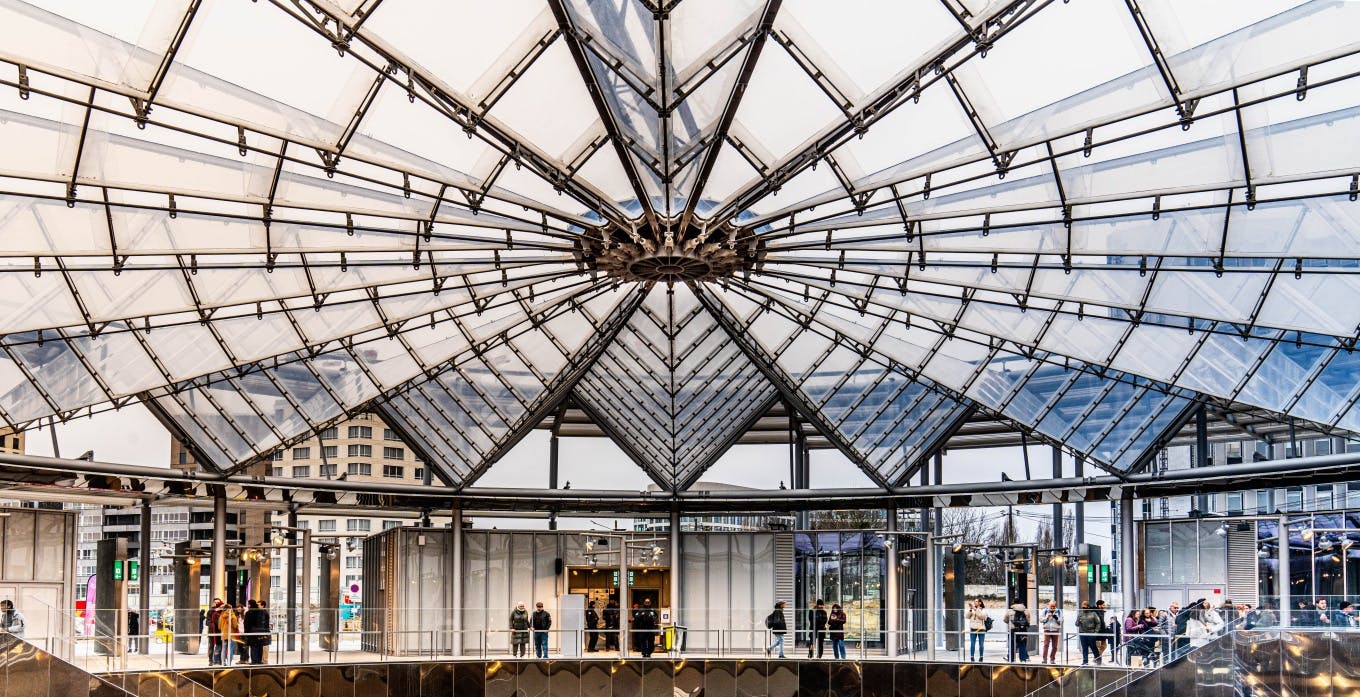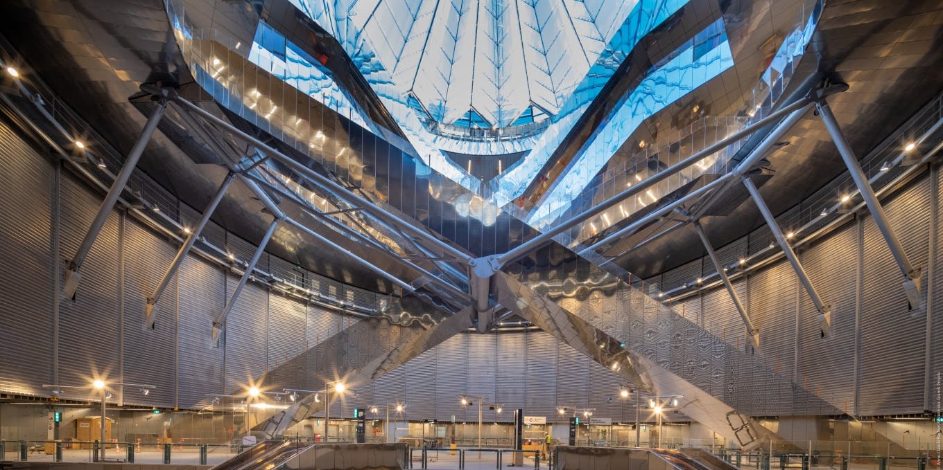 Prenant la forme d'un cylindre vertical, la station Villejuif - Gustave Roussy profite d’une belle lumière naturelle, qui éclaire les quais jusqu’à 50 mètres sous le niveau du sol grâce à un dôme vitré monumental.