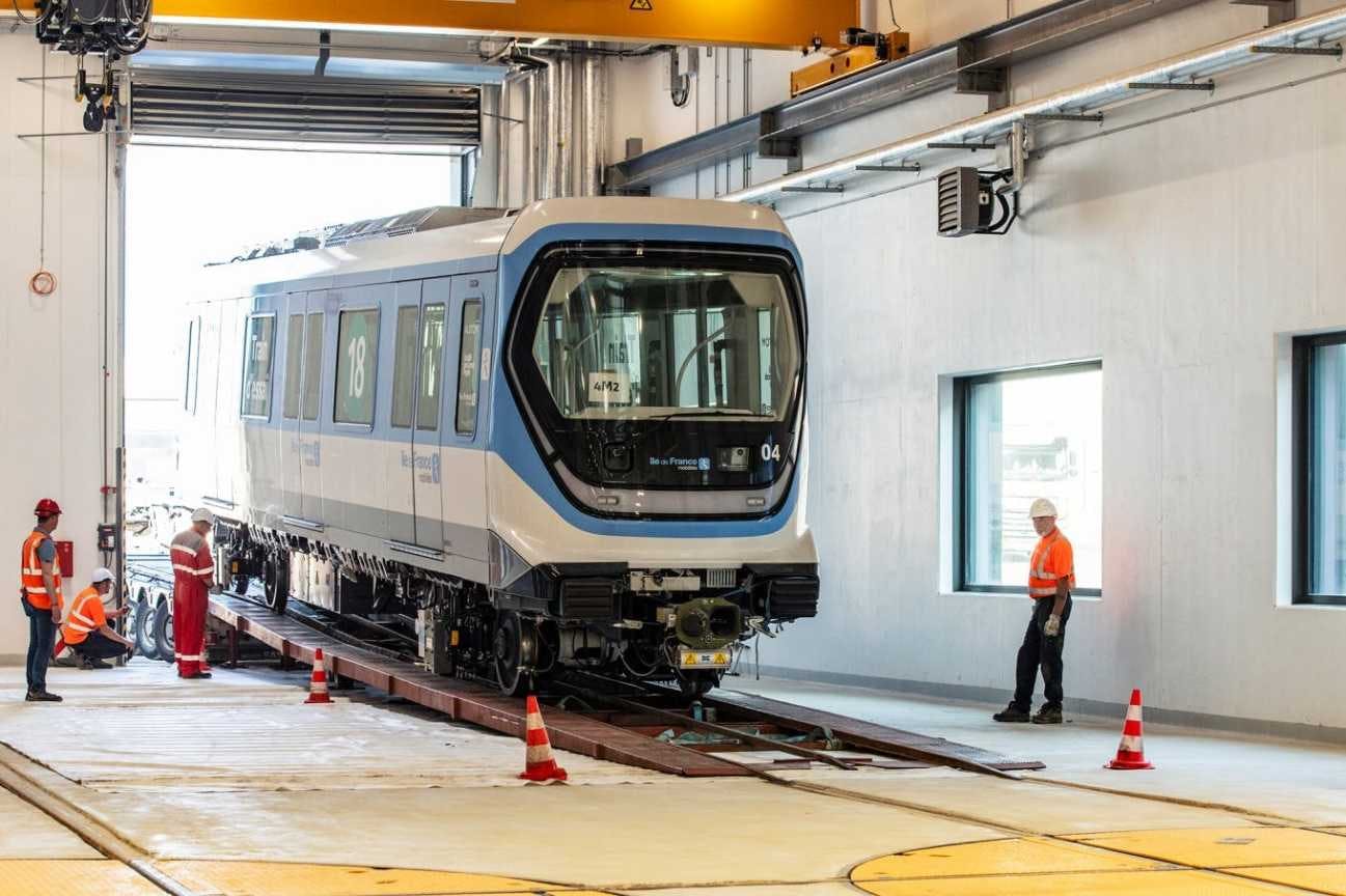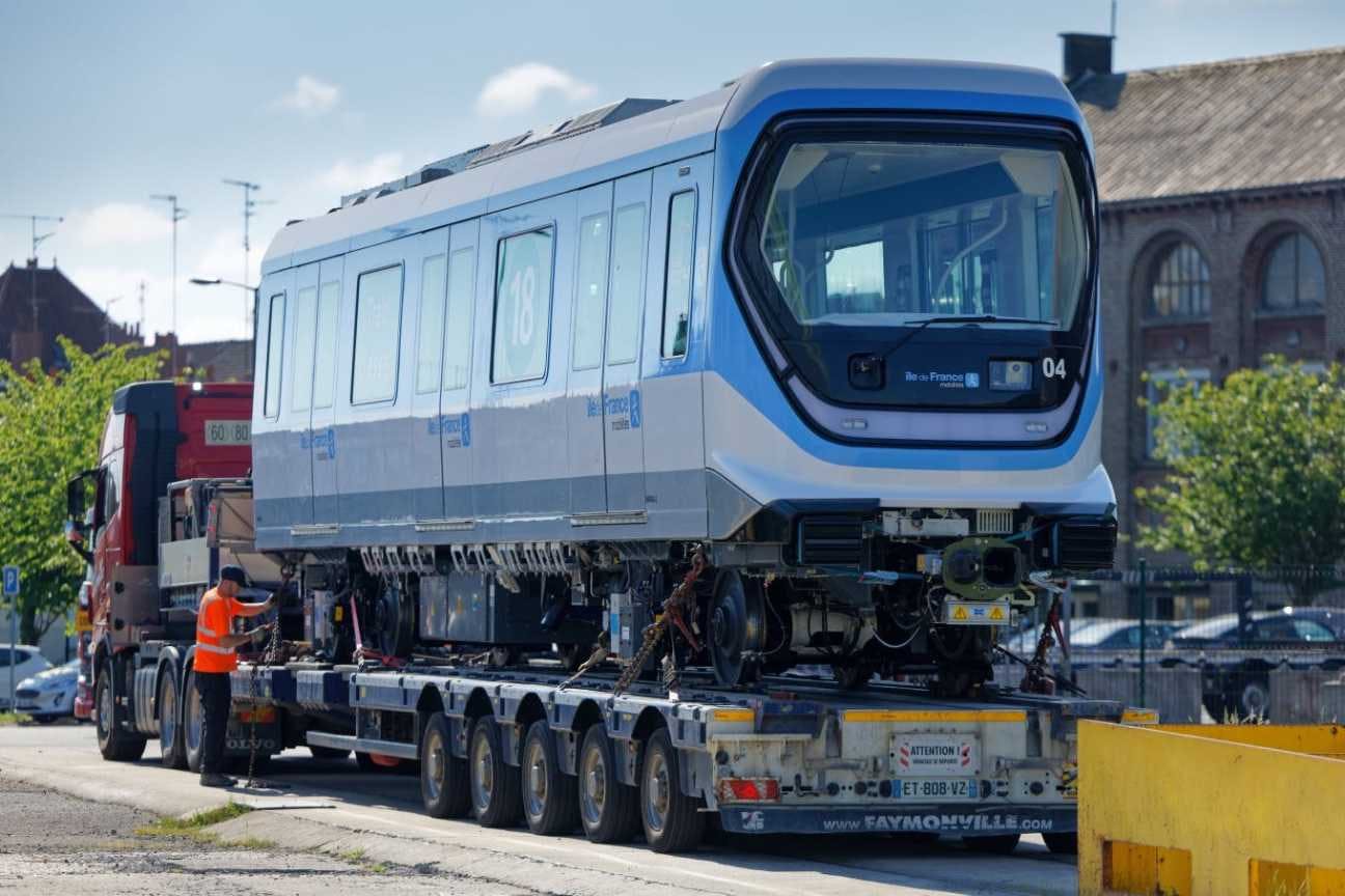 La première rame, acheminée des usines de construction d'Alstom à Valenciennes par convoi exceptionnel, est arrivée en mai au Centre d'exploitation de Palaiseau (en Essonne) où seront prochainement lancés les premiers essais.
