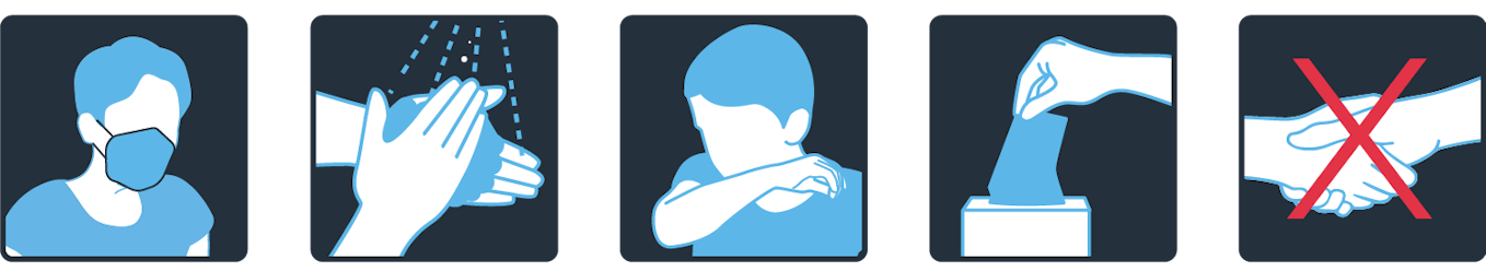 Rappel des gestes barrières : port du masque, lavage des mains, tousser ou éternuer dans votre coude ou un mouchoir, utilisez des mouchoirs à usage unique et jetez-le directement à la poubelle, saluez sans se serrer la main et évitez les embrassades.