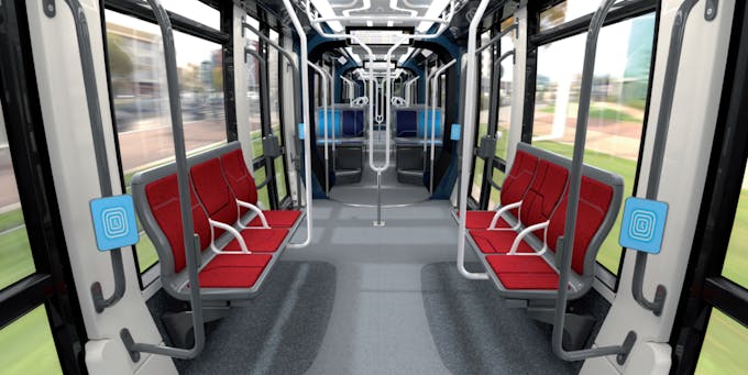 - Une histoire de lumière : la signature lumière, c'est crucial. Sensation de sécurité la nuit tombée, information visuelle sur l'ouverture et la fermeture des portes et la descente du véhicule à destination des personnes malvoyantes et malentendantes, impression d'espace même en période de forte affluence grâce à de grandes baies vitrées : chaque détail a été pensé.