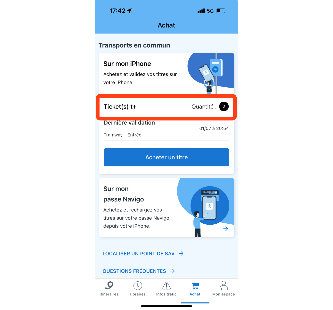 Vous avez acheté des titres de transport avec votre téléphone ou votre montre Samsung Galaxy Watch ? Consultez les en vous rendant sur l’onglet "Achat" ou "Titres" de l'application Île-de-France Mobilités.