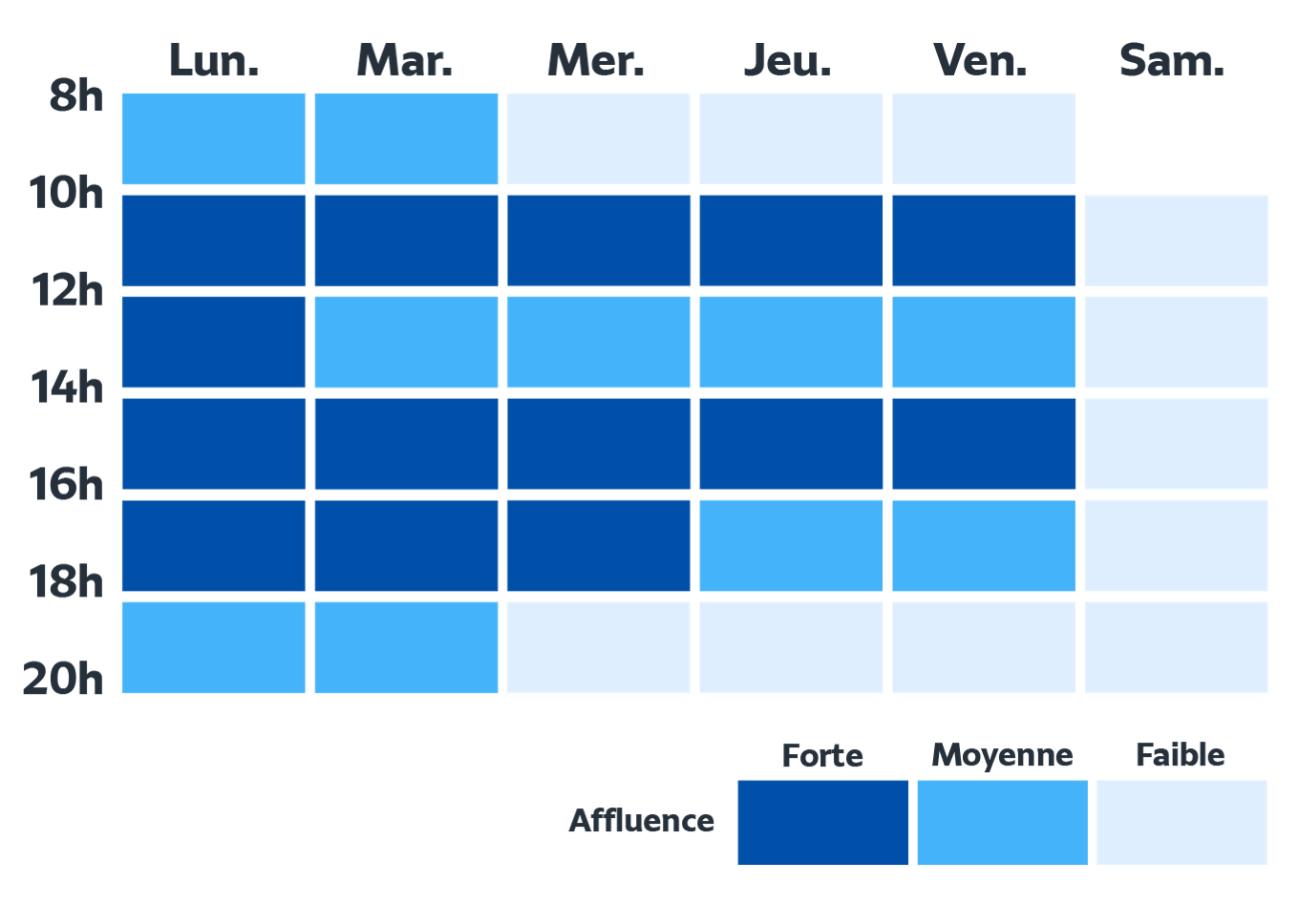 - Pour réduire votre temps d'attente, veuillez privilégier les appels pendant les heures de faible affluence (cf. tableau ci-dessous)