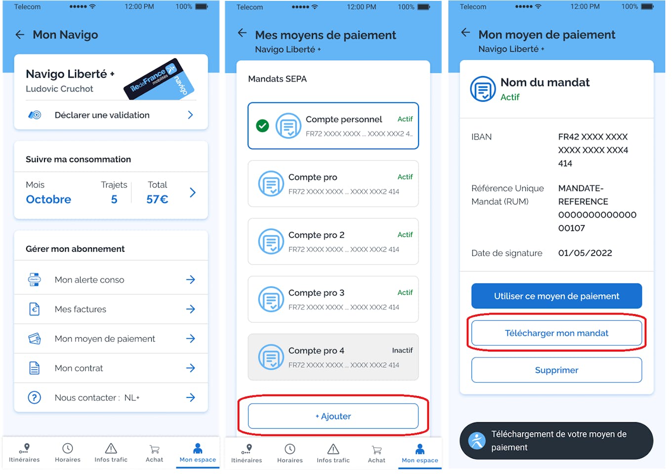 Dans votre application Île-de-France Mobilités, rendez-vous dans votre espace Navigo Liberté +, puis « Mon moyen de paiement ». Vous accédez alors aux mandats SEPA que vous avez enregistrés.