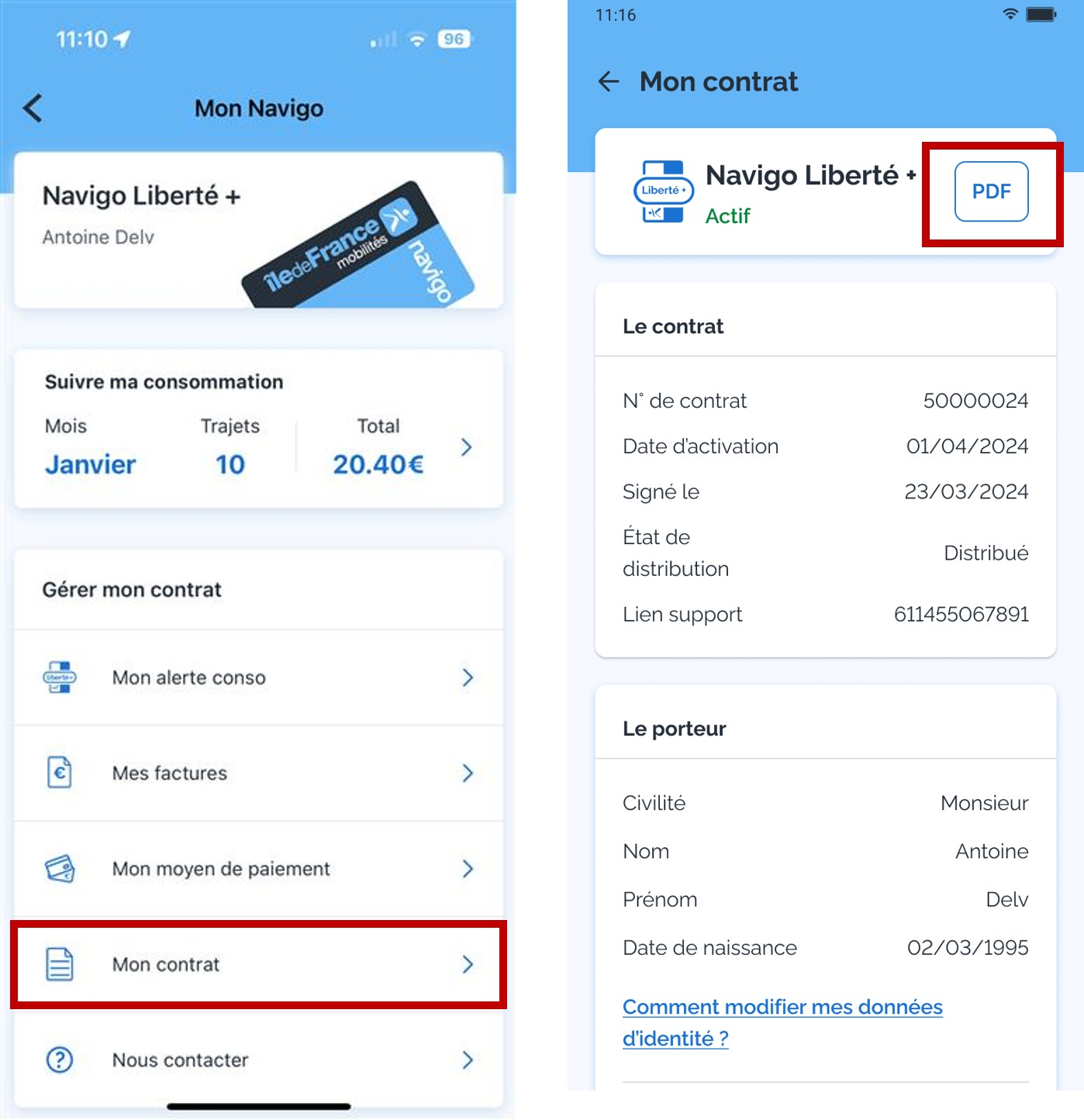 Vous pouvez consulter les données de votre contrat dans votre espace personnel sur l’application Île-de France Mobilités, en cliquant sur « Mon contrat ».