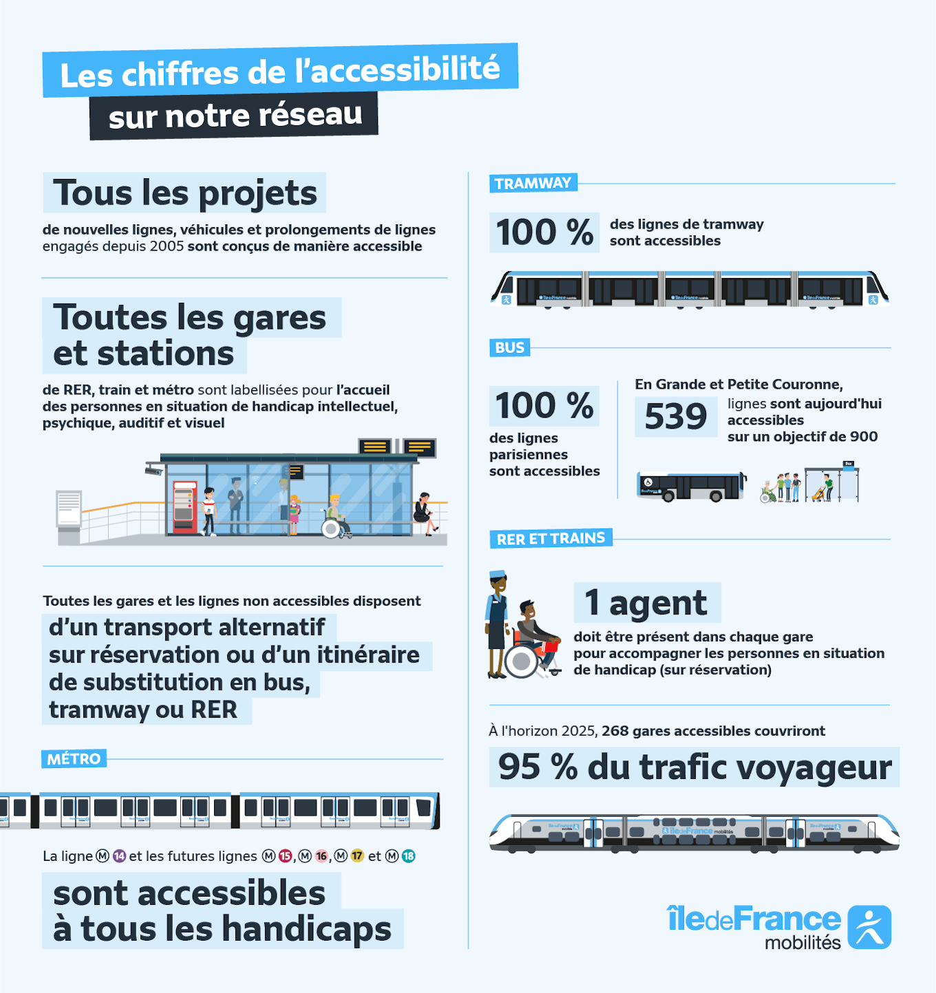 Alle Projekte für neue Bahnhöfe, neue Linien, Streckenverlängerungen oder neue Fahrzeuge (U-Bahnen, Busse, Straßenbahnen, RER und Züge), die nach 2005 realisiert wurden, wurden in Übereinstimmung mit den Standards der Barrierefreiheit konzipiert und bieten Verbindungen mit Linien, die ebenfalls barrierefrei sind!