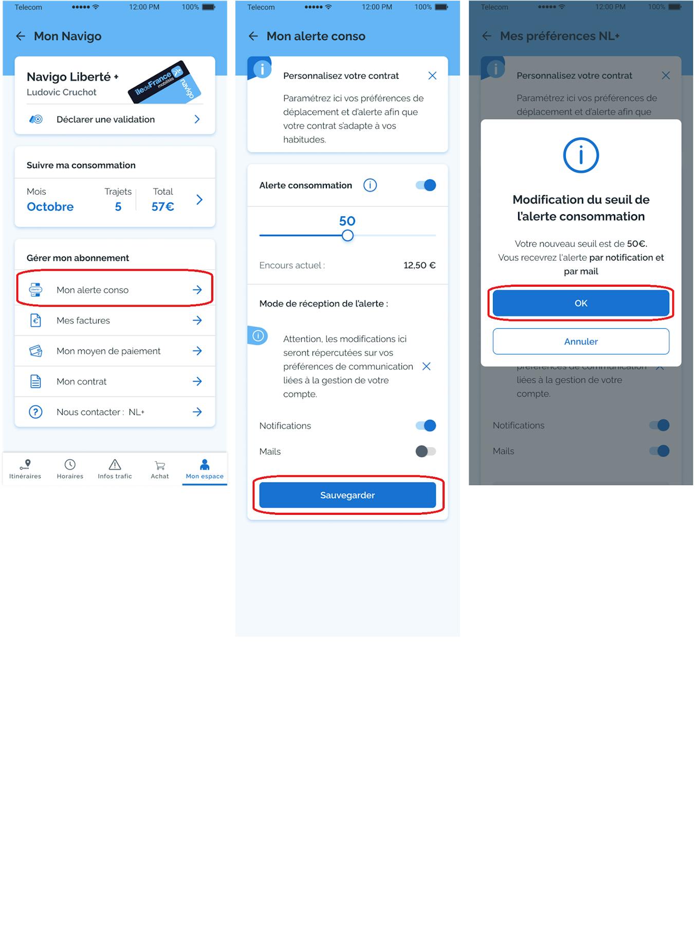 Gehen Sie in Ihrer Île-de-France Mobilités-App zu Ihrem Navigo Liberté + Space und klicken Sie auf "Meine Verbraucherbenachrichtigung". Wählen Sie dann den Betrag des Schwellenwerts aus, der nicht überschritten werden soll.
