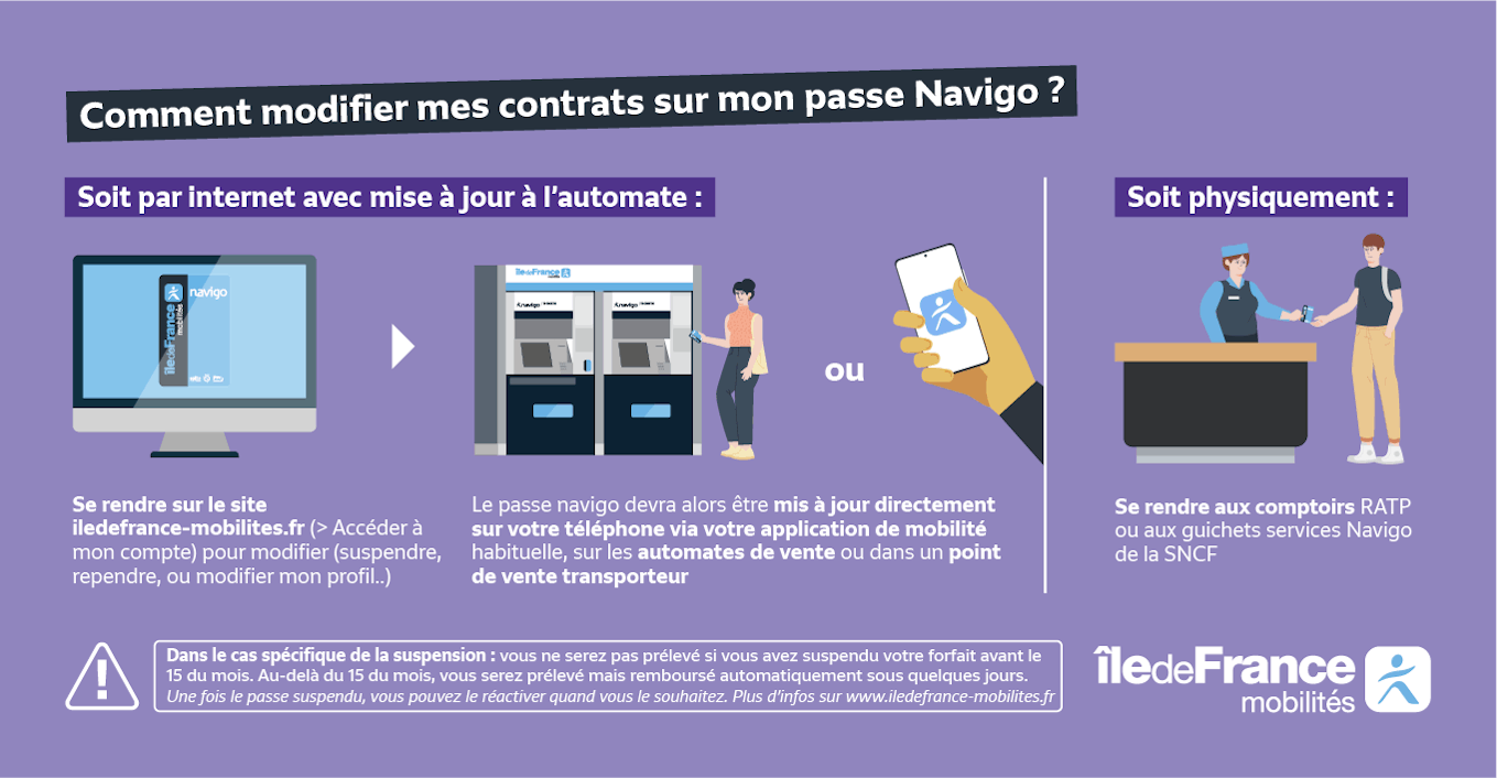 - oder telefonisch über die App der Île-de-France Mobilités oder die der offiziellen Händler, um die Aussetzung abzuschließen.