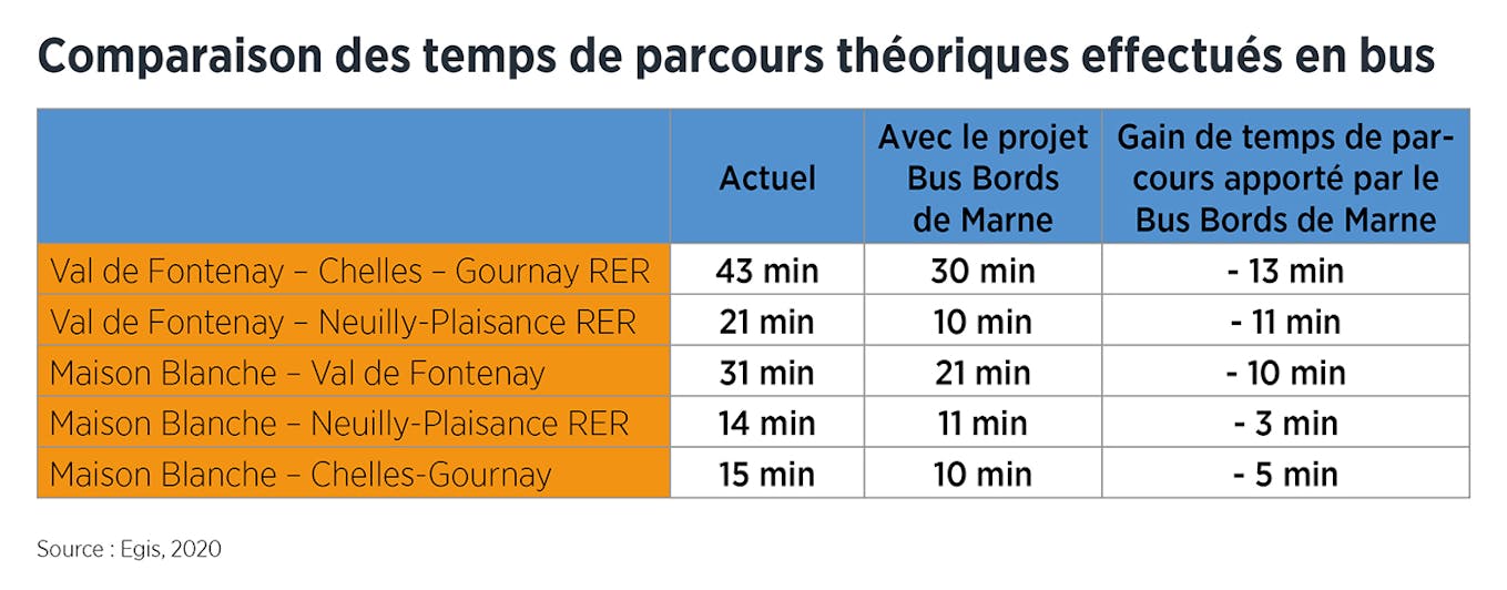 Die folgende Tabelle enthält einige Beispiele für die Fahrzeiten vor und nach der Inbetriebnahme des Projekts Bus Bords de Marne. Die aktuellen Fahrzeiten werden auf der Grundlage theoretischer Zeittabellen ermittelt und berücksichtigen nicht die heute beobachteten Verkehrsschwierigkeiten. Dank des Projekts werden die Busse an Regelmäßigkeit gewinnen und die Reisezeitersparnis wird sogar größer sein.