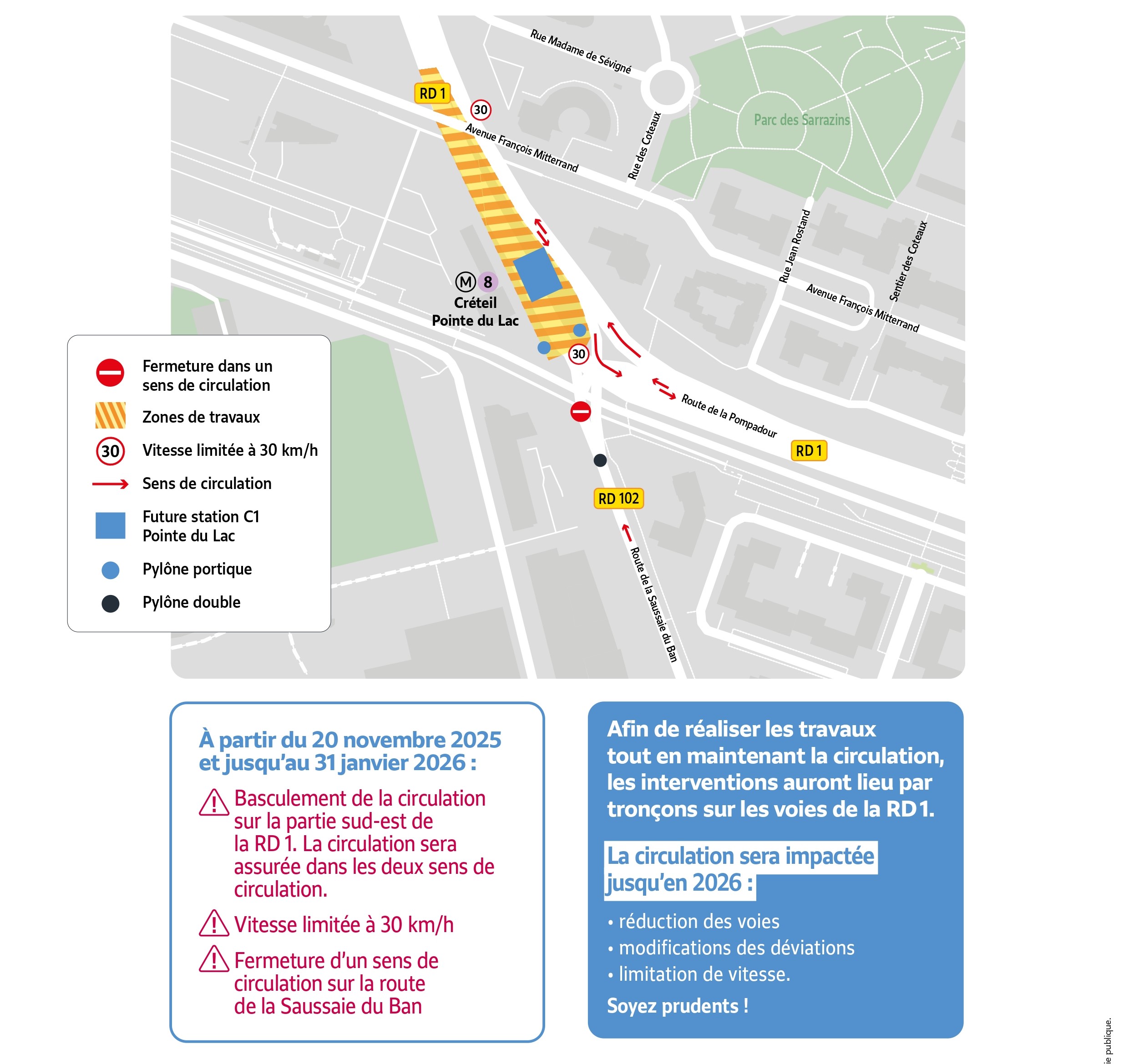 Im Rahmen des Baus der zukünftigen Station Pointe du Lac und der Fußgängerbrücke, die die Metrostation 8 mit dem Einkaufszentrum François Mitterrand verbindet, sind Straßenarbeiten auf der RD 1 geplant.